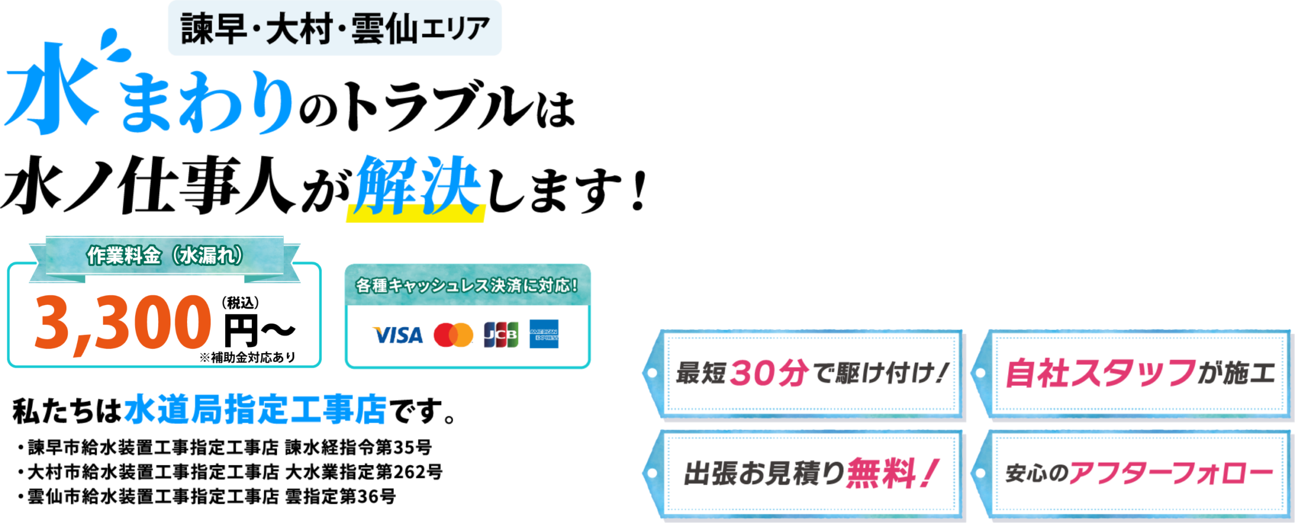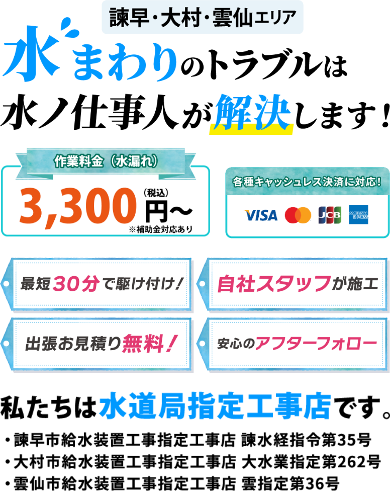 長崎県の認可を受けた指定工事業者として長年、修理・施工を続けている弊社だからこそ、地元ならではのノウハウ、ネットワークを活かしたご提案が可能です。「解決の先の感動を」「あなたの暮らしの一番の理解者」が、水ノ仕事人のモットーです。お気軽にお問い合わせください。